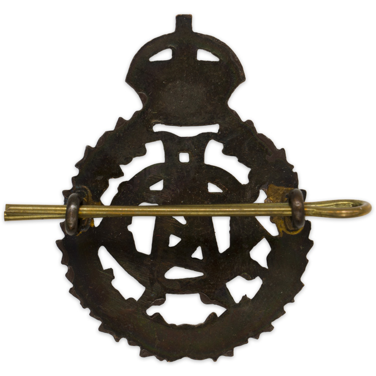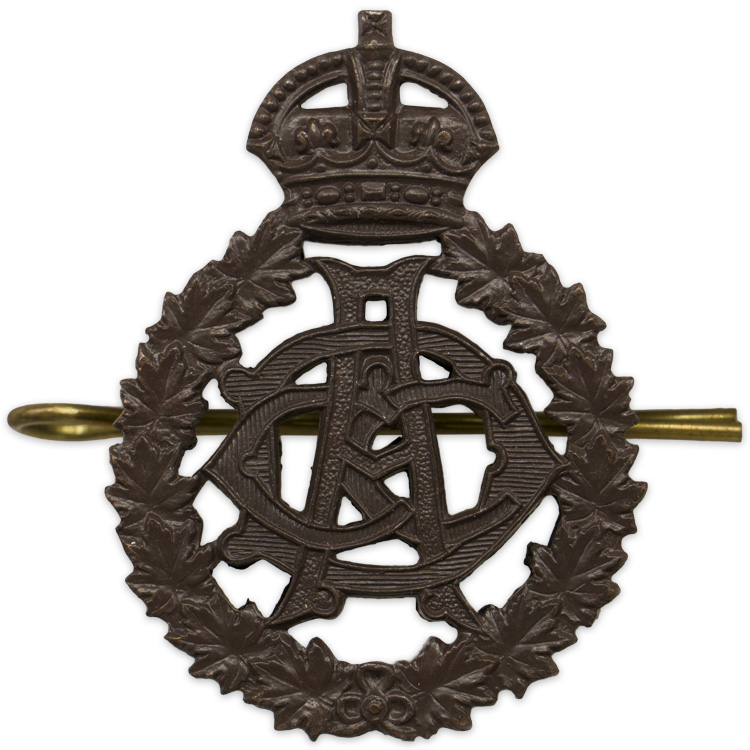 PHYSICAL DESCRIPTION: A browned, 3cm x 4cm badge features the letters "C.A.D.C." central to the badge with oak leaves to the outside. A Kings Crown intersects at the top. There are a pair of lugs to the flat reverse, as well as a cotter pin.