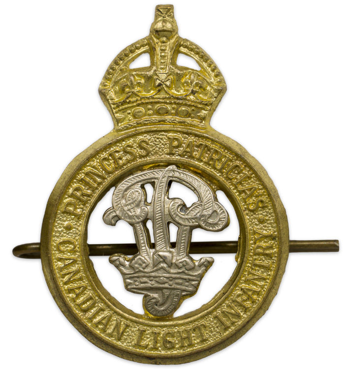 PHYSICAL DESCRIPTION: A circular brass and silver alloy badge surmounted by a Kings Crown measures approximately 5cm x 3.5cm that features the inscription "Prince Patricia’s Canadian Light Infantry" to it’s border with a stylized center in silver alloy. The reverse has two lugs present along with a cotter pin