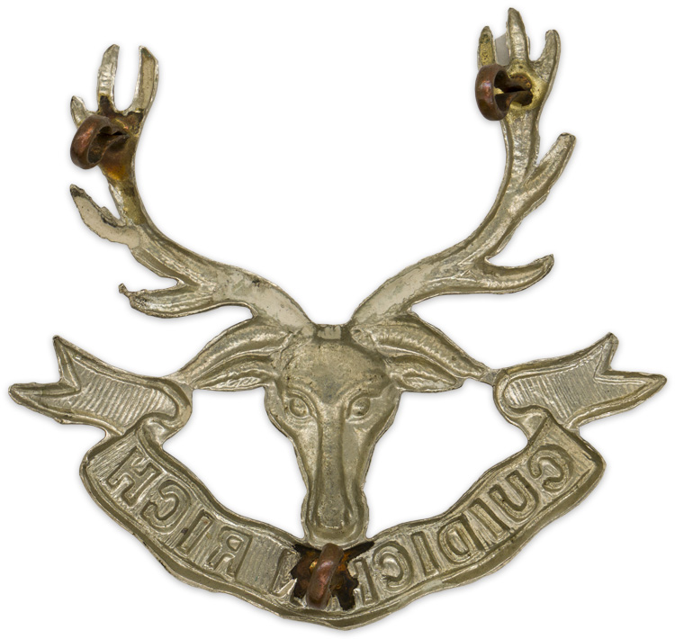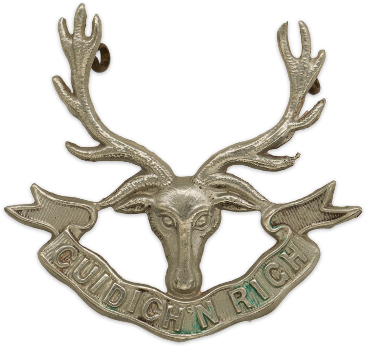 PHYSICAL DESCRIPTION: A stamped metal alloy badge depicting a stags head with a banner, that is inscribed "Cuidich’n Righ" or "Aid the King" to its bottom. The reverse is a mirror image of the front with three lugs present. The badge measures approximately 6cm x 6cm.