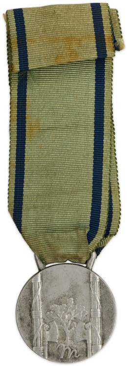 Throughout the Fascist regime, Mussolini encouraged families to have as many children as they possibly could. One of the ways in which they rewarded a bigger family, was by handing out these Italian Fascist mother’s medal. This medal is 15cm long by 4cm wide at the ribbon and 37mm at the medal. The ribbon is a dark taupe green with 2 vertical navy blue lines on both edge. There are seven aluminum bows that descend the ribbon. Each one represents a child. The face of the medal, which is made of metal, it of a mother surrounded by her seven children, with Unione Fascista Famiglie Numerose engraved. On the back the design bears a Stylized M, with columns. The ribbon shows light fading.