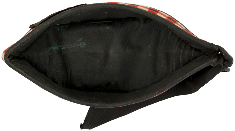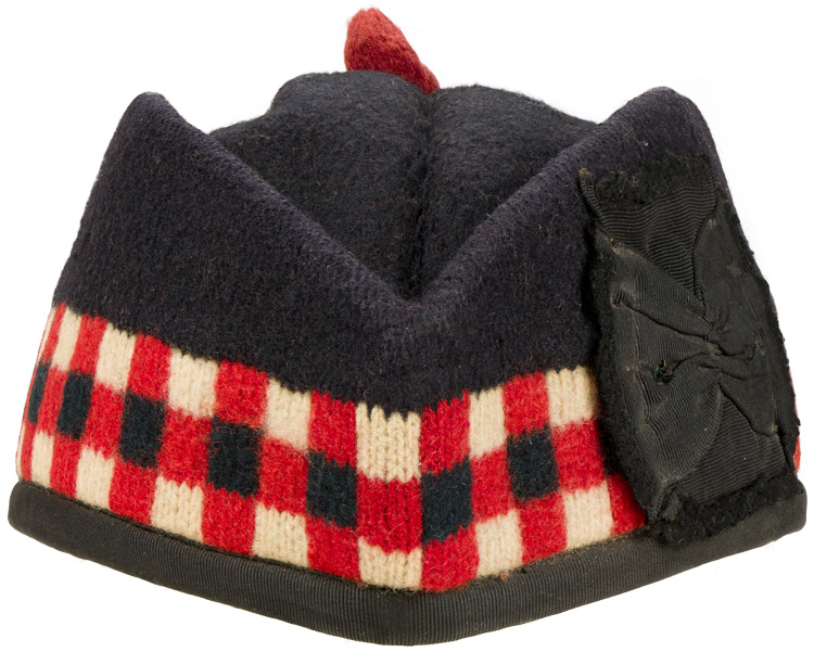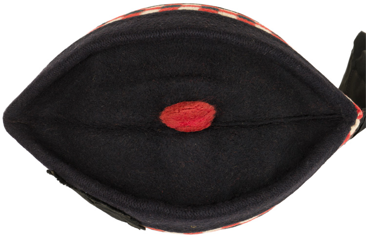 PHYSICAL DESCRIPTION: A black woven wool "wedge" cap has a red wool Touri (pom-pom) to its crown, black rayon edging along its base, and approximately 26cm long, dual black rayon ribbons, with swallow-tail cut ends, extend from its reverse. A 3.5cm tall diced band is along its sides, in white, red and black, over the left front of which is fixed a black rayon rosette. The interior is fully lined. There does not appear to be any visible markings.