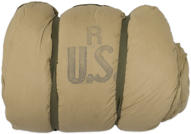 A “R” “US” stamped, mummy shaped, down filled sleeping bag with a working heavy duty zipper and tie tapes to the bottom.