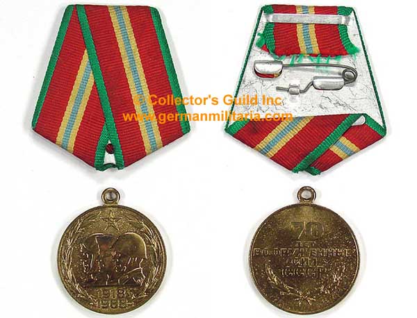 C025160 JUBILEE MEDAL ESTABLISHING ANNIVERSARIES OF THE USSR ARMED FORCES. Die-struck alloy, 32mm diameter. Parade mount ribbon with pin back device. Missing metal loop. Commending 70 years of service. Ribbon colors are green/red/yellow/green/yellow/red/green. Nice untouched condition.