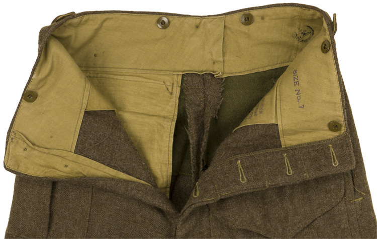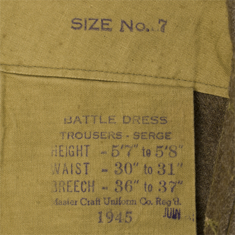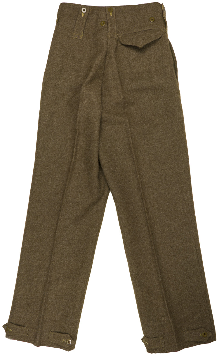 PHYSICAL DESCRIPTION: Standard issue, olive drab wool battle dress trousers with a four button front fly closure, with an additional button at the waist, vertical slash side seam pockets, a large patch pocket to the left forward thigh with a scalloped flap and hidden button closure, a smaller patch pocket to the right forward thigh with an open top and a button closure partially obscured by its single pleat, and a horizontal slash pocket with a scalloped flap and hidden button closure to the rear right. Four vertical straps are sewn along the waistband, each terminating in button closures to their tops. Similar buttons are between each of these straps, as well as having six mis-matched metal dish buttons to the interior of the waistband. The interior waist band are stamped with a "C" broad arrow, size, measurements, manufacture name and date of 1945. Nice pressed seam.