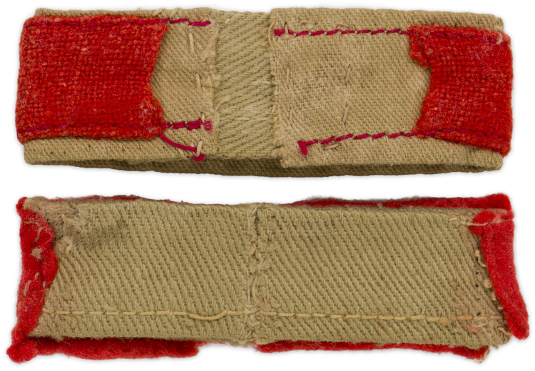 Rare pair of national shoulder titles for Rhodesia, with black embroidery on red felt backing. These devices slipped over the shoulder straps of some element of the British 8th Army (usually the South African division) to denote the soldier’s origins in the British colony of Rhodesia. The white male population of Rhodesia before and during WWII was quite small, so to prevent the male population from being decimated in the war (and prevent the appearance of using the men of the Commonwealth colonies as cannon fodder, as was the case in World War I), Great Britain was careful to limit the number of Rhodesians in combat units in WWII. This pair of slip-ons is in very good condition, mismatched but always together as a pair. They measure approximately 6.5cm x 2cm.