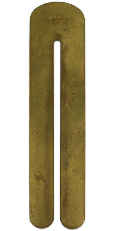 A brass construction polisher that measures approximately 17cm x 4cm that is numbered to each side, as well as marked "C.C.B."
