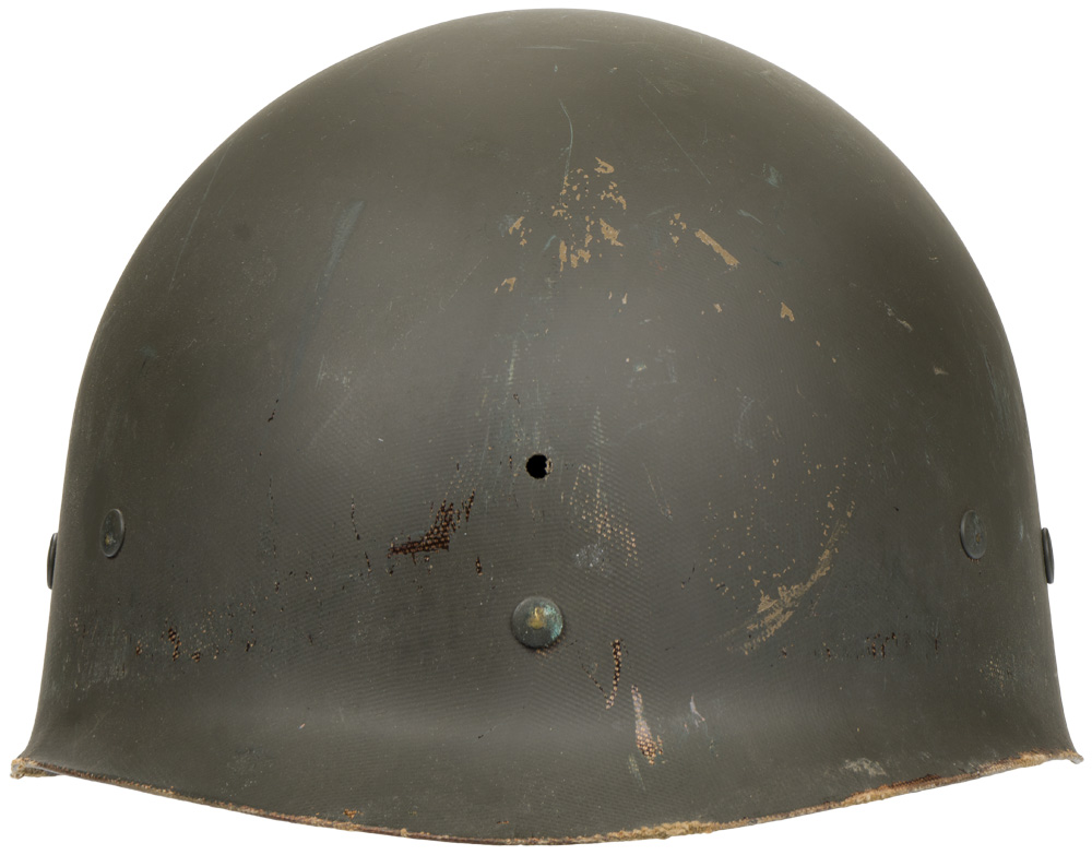 BACKGROUND: The M 1 helmet was developed as a replacement for the M 1917 helmet that had seen use since WW1. It was designed by using the crown of the M 1917, removing the brim and adding extensions to protect the neck, ears, and forehead. The resulting form was then used as a template for the production of a helmet body from a single piece of Hadfield Manganese Steel. The liner and suspension were developed after a modified Riddel Football helmet. The M 1 helmet was approved for production in June of 1941. Early models had solid loops (fixed bale) for the chin straps but they broke off to often and were replaced with a moveable hinged loop. The original rim of the helmet was made of stainless steel but it was found that the paint that was used would wear off to easily and leave a shiny reflective surface. To remedy this they switched to a Hadfield Manganese Steel and also changed the butt of the rim from the front to the rear of the helmet body. This change took place in October of 1944. The M 1 helmet had the best ballistic characteristics of any helmet developed up to then and could with stand the force from a 230 grain, .45 caliber bullet with a velocity of 800 feet per second.