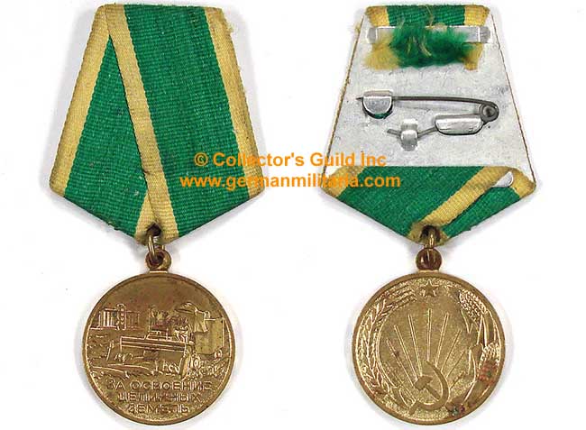 C025960 MEDAL FOR RECLAMATION OF THE VIRGIN LANDS. Die-struck alloy 32mm diameter. Complete metal loop with parade mount ribbon with pin back device. Ribbon colors are yellow/green/yellow. Nice untouched condition.