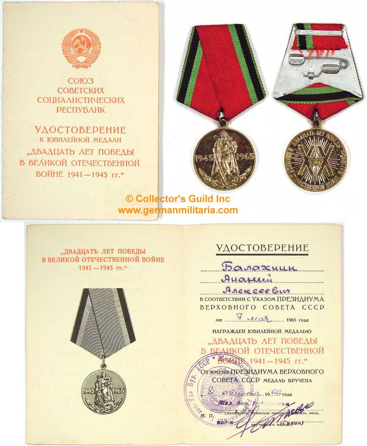 C026060 JUBILEE MEDAL ESTABLISHED ON THE 20th ANNIVERSARY OF VICTORY IN THE GREAT PATRIOTIC WAR. Die-struck alloy 32mm diameter. Complete metal loop with parade mount ribbon with pin back device. Ribbon colors are black/green/red. Nice untouched condition. Complete with original awards document.