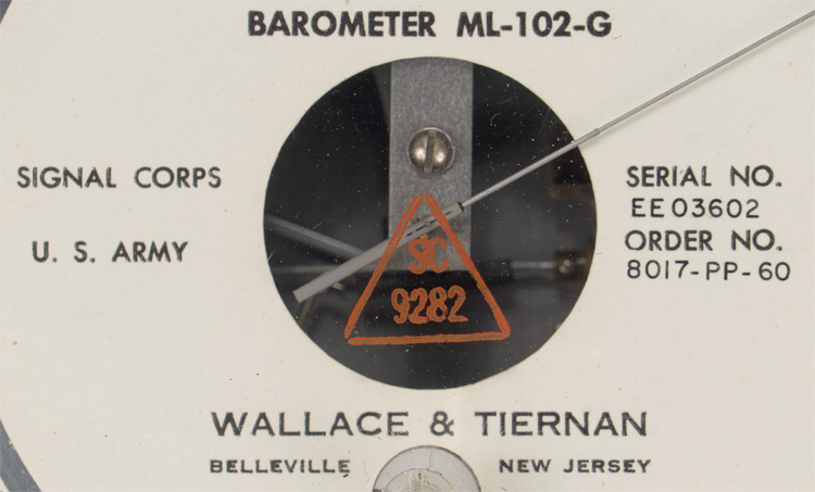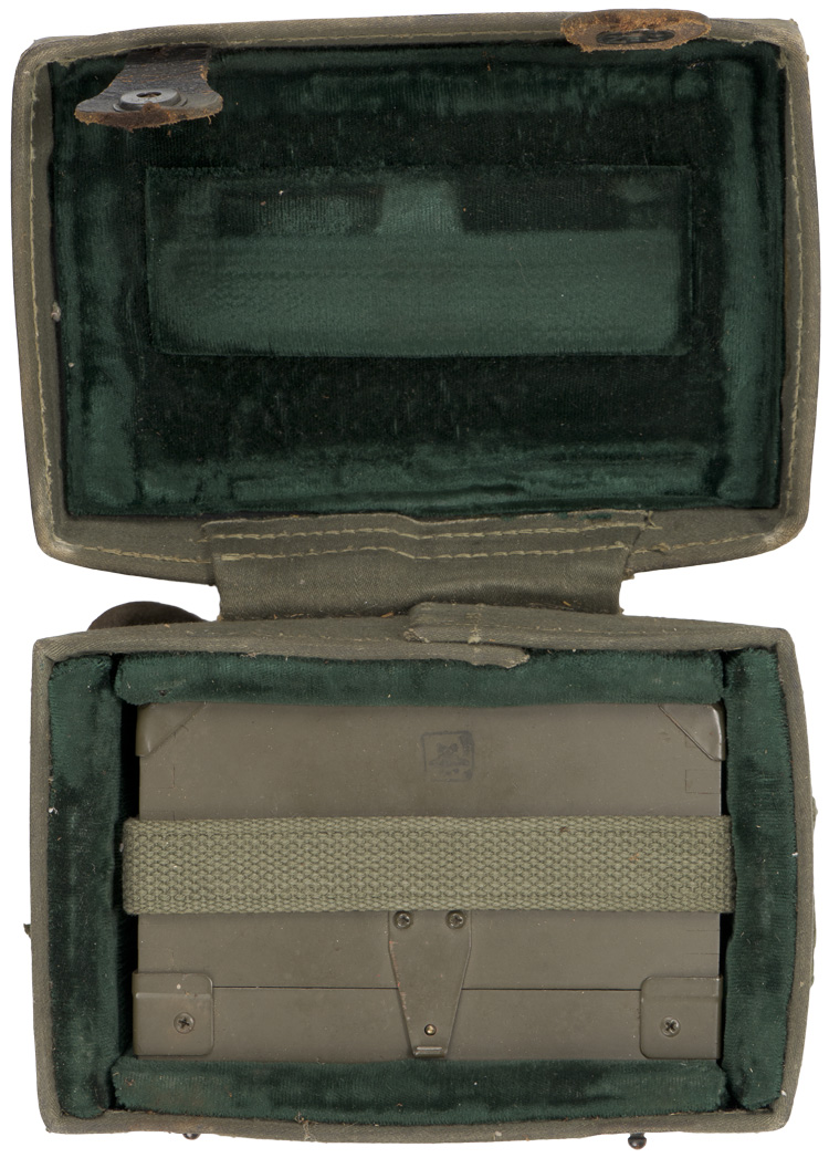 A rigid, olive drab webbed case with green velvet lining that houses the ML-102-G aneroid barometer that is manufactured by Wallace & Tiernan of Belleville, New Jersey. The barometer measures approximately 10cm x 16cm x 16cm with webbed handle, while the case measures approximately 14cm x 21.5cm x 22cm with webbed carrying handle and lift the dot snaps to the front panel.
