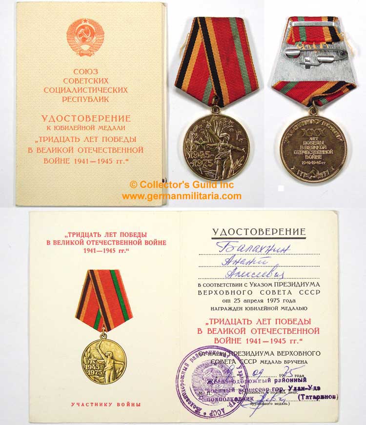 C026860 JUBILEE MEDAL ESTABLISHED ON THE OCCASION OF THE 30th ANNIVERSARY OF VICTORY IN THE GREAT PATRIOTIC WAR. Die-struck alloy 32mm diameter. Complete metal loop with parade mount ribbon with pin back device. Ribbon colors are black/gold/red/green. Nice untouched condition. Complete with original awards document.