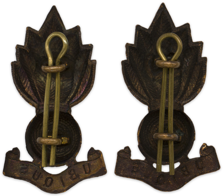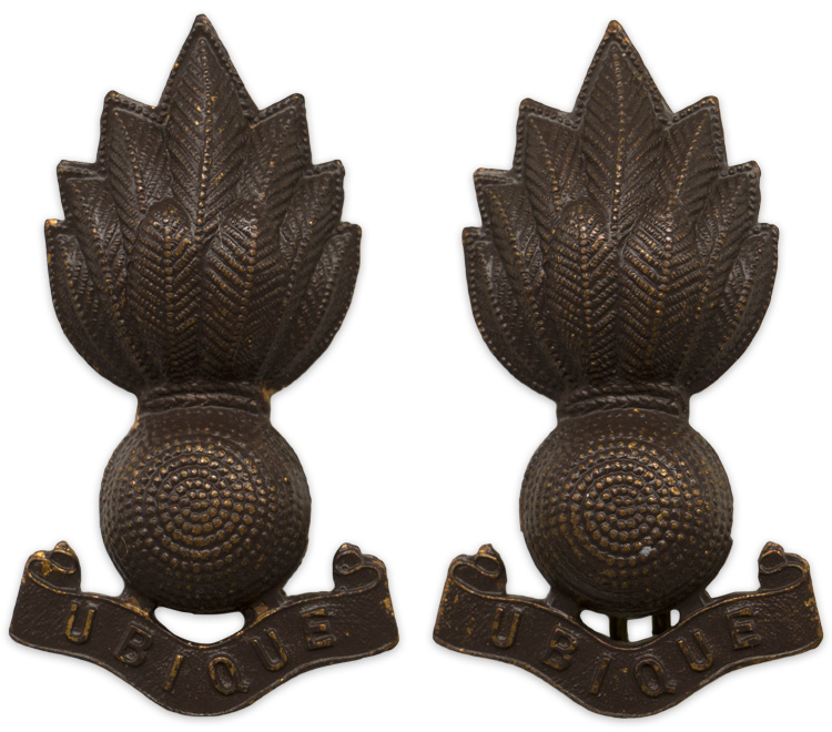 A pair of collar insignia depicting a flaming bomb with nine "flames" with a scroll with the motto "UBIQUE" (Everywhere). A pair of lugs and cotter pins are to the reverse.