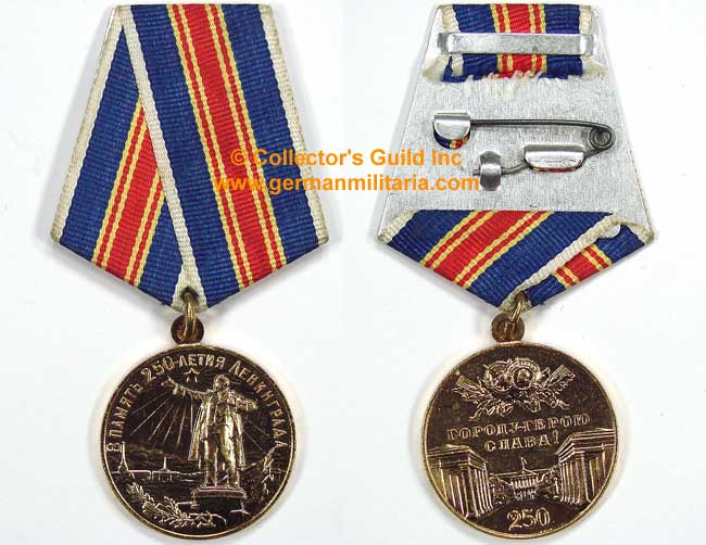 C027360 MEDAL MARKING THE 250th ANNIVERSARY OF LENINGRAD. Die-struck alloy 32mm diameter. Complete metal loop with parade mount ribbon with pin back device. Ribbon colors are brown/blue/gold/red. Nice untouched condition.