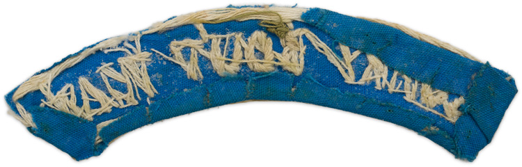 A hand made, South Vietnam theatre, rocker badge for a boonie hat. It bears white hand- stitched letters on sky blue background. The badge measures approximately 1.5cm x 9cm.