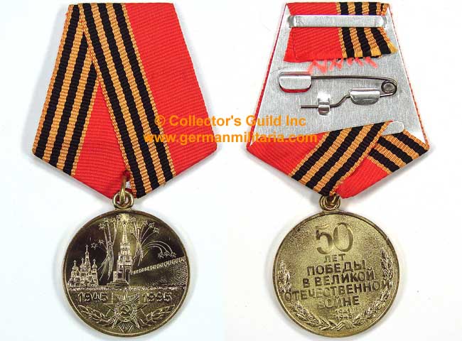 C028260 MEDAL MARKING THE 50th ANNIVERSARY OF THE VICTORY IN THE GREAT PATRIOTIC WAR. Die-struck alloy 32mm diameter. Complete metal loop with parade mount ribbon with pin back device. Ribbon colors are gold/black/red. Nice untouched condition.