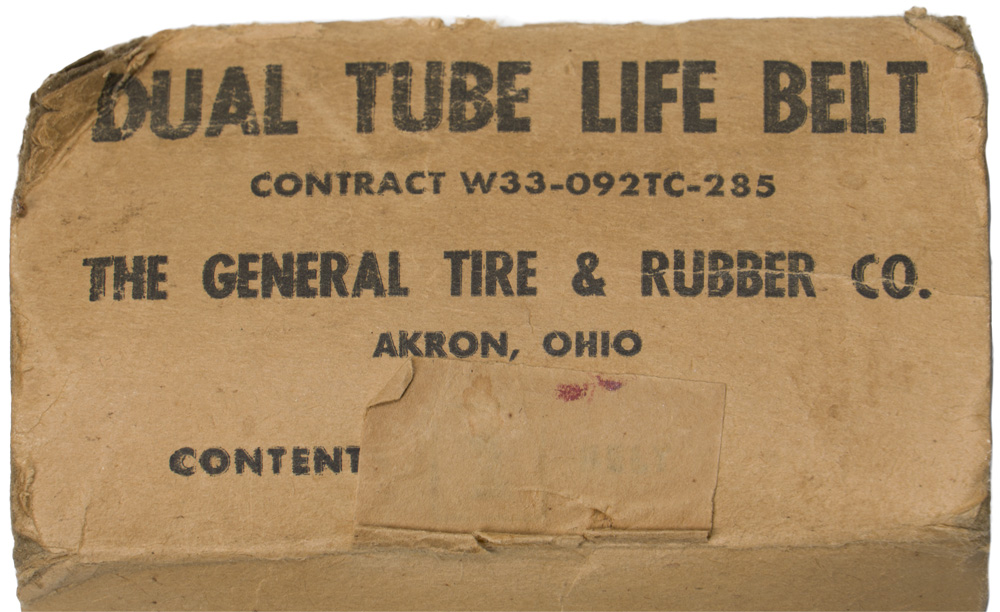 An un-issued, not worn original belt manufactured by “The General Tire & Rubber Co., Akron, Ohio”. The cardboard carton is torn with only a portion of the original carton in tact. The flap is torn off, but included. All hoses, fittings and snaps are complete. Remains supple