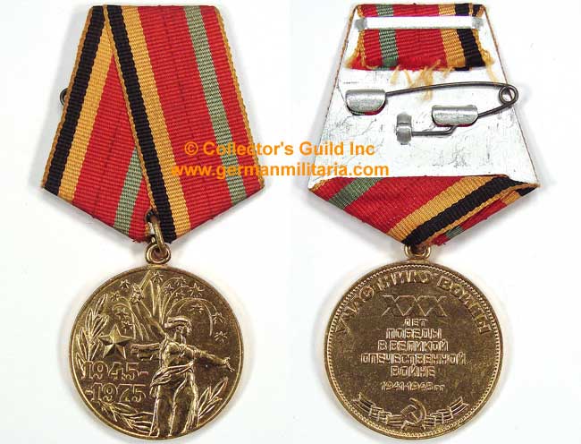 C029360 JUBILEE MEDAL ESTABLISHED ON THE OCCASION OF THE 30th ANNIVERSARY OF VICTORY IN THE GREAT PATRIOTIC WAR. Die-struck alloy 32mm diameter. Complete metal loop with parade mount ribbon with pin back device. Ribbon colors are black/gold/red/green/red. Nice untouched condition.