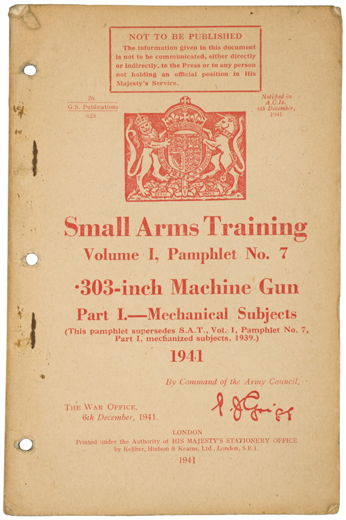 This pamphlet was authorized by "The War Office 6Th December, 1941". It is "Volume 1, Pamphlet No. 7" in a series and "Part I.-Mechanical Subjects.". It measures approximately 12cm x 18.5cm with three holes punched by the spine for storage in a binder. It contains 79 pages of black and white plates and text.. The pages show yellowing with moderate/heavy usage to the covers.