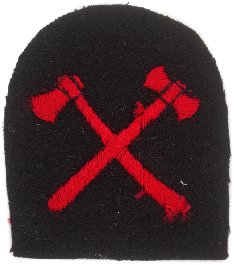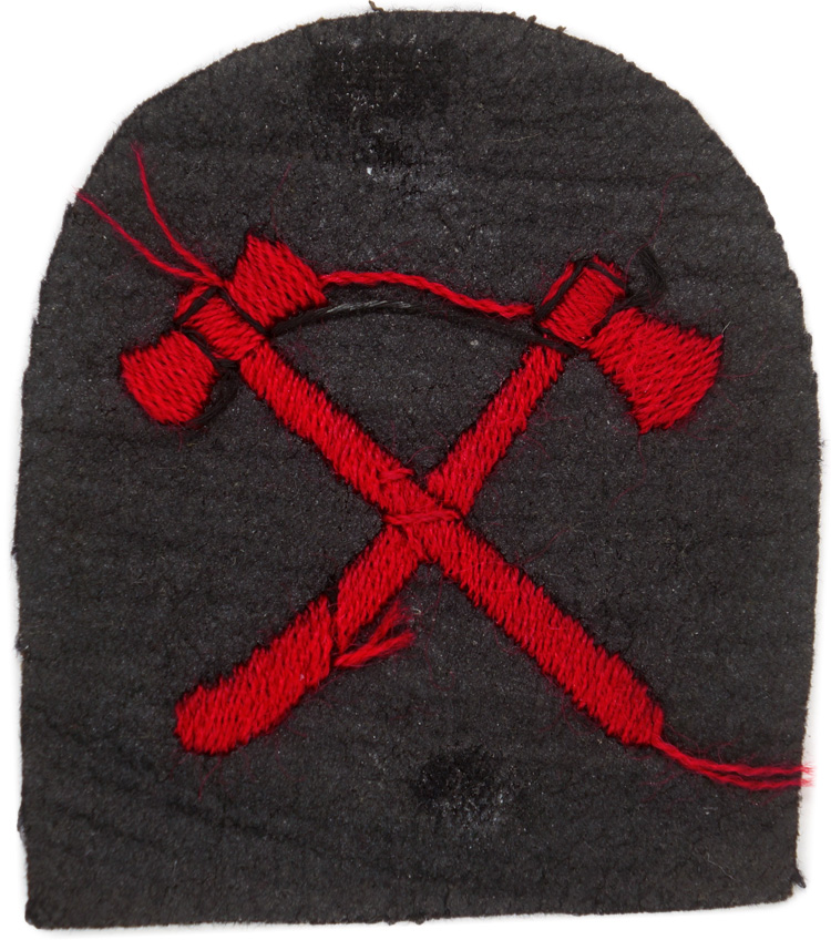 A black wool badge machine embroidered. Badge measures approximately 7.5cm x 8.5cm.