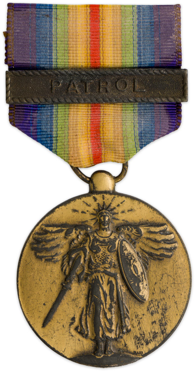 PHYSICAL DESCRIPTION: The circular bronze medal is about 37mm in diameter, with a suspension ring. The front shows the winged figure of Victory while the reverse of the medal has the Italian center motif along with the names of the fourteen Allied countries. The ribbon is complete with its original pinback device with a "Patrol" bar for war patrol service on the Atlantic Ocean from May-November 1918. The surface of the medal shows moderate usage and wear.