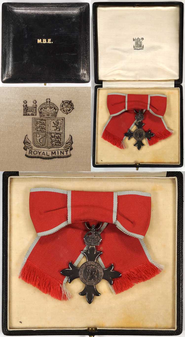 This order of chivalry was established by King George V in 1917 to which there are five classes in civil and military divisions, including the "Member of the Most Excellent Order of the British Empire." This civilian, woman’s breast badge has a pink silk bow trimmed in grey from which a cross, surmounted by the Kings Crown is suspended from a ring. The front displays the head and shoulder profile of King George V and Queen Mary encircled by the words "For God and The Empire", while the reverse shows the cypher of King Emperor George V. The plate of the simple hinge clasp is marked "Sterling". The original "Royal Mint" hinge case is marked "M.B.E. in gilt letters to the lid and measures approximately 14.5cm 13.5cm x 2.5cm with a push button release to the front and is lined in white silk and velvet.GRADE **** PRICE $450.00 (Or Best Offer)