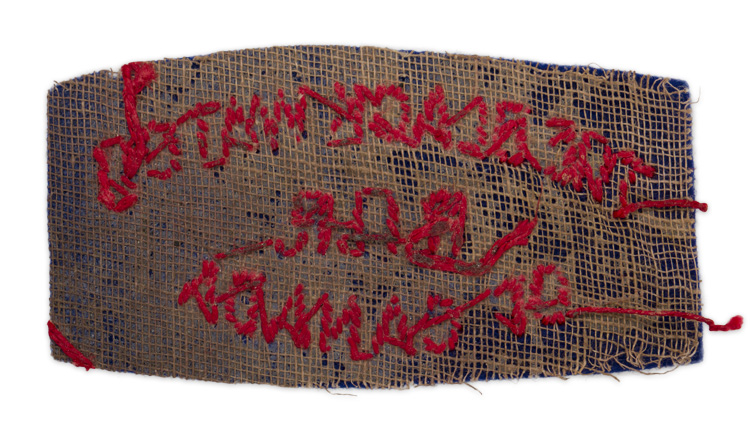 PHYSICAL DESCRIPTION: A single blue melton flash that is machine embroidered in red thread "The Black Watch" atop "R.H.R." and "Of Canada". They are complete with the original backings. British manufactured.