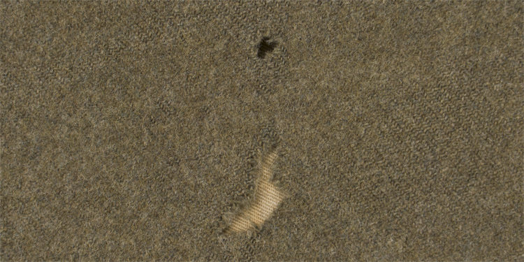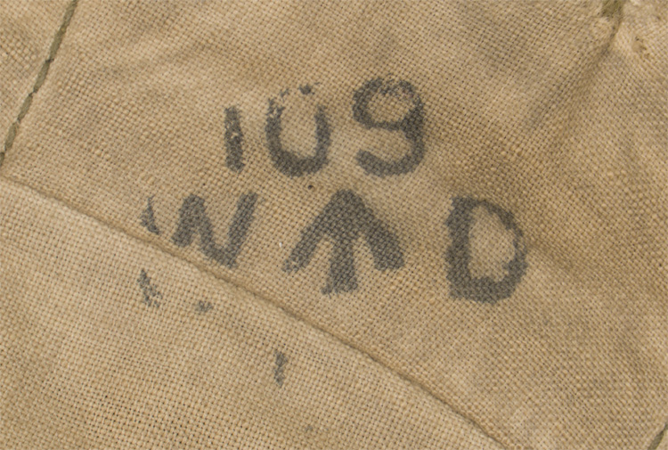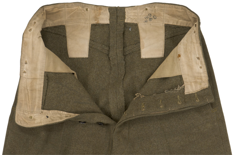 A pair of straight leg trousers with a five button fly with all buttons being replaced/mis-matched. A British Department war marking is stamped to the waist band. Nine matching, stamped alloy buttons extend around the waistband to allow for the attachment of suspenders. The waist measures approximately 32" with a 31.5cm inseam. The wool shows typical wear with a hole/tear to the front, as well as some light mothing.