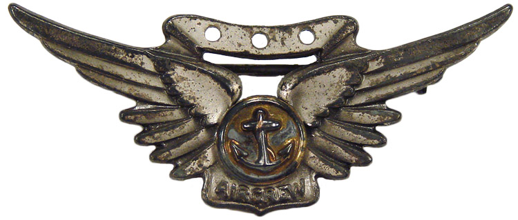 A two piece sterling pair of wings measuring approximately 2cm x 5cm with a central emblem of a fouled anchor with "Air Crew" below. The gilt has 99.9% worn off. Surmounting the wings is a ribbon with the insignia of three five pointed stars missing. To the reverse is a simple pin clasp to the flat back and is inscribed "Amico" and "Sterling." The badge shows heavy wear and age, but overall a nice salty example.