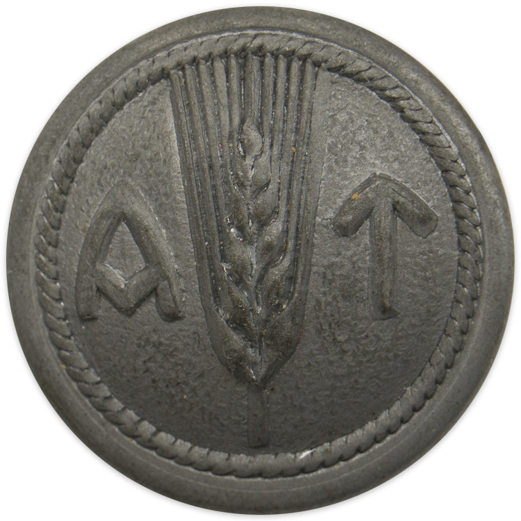 PHYSICAL DESCRIPTION: A 25mm button with tangs to the reverse, while the front shows the letters "A" & "T" (Arbeids-Tjensten) with a spade to the center on a ribbed background.