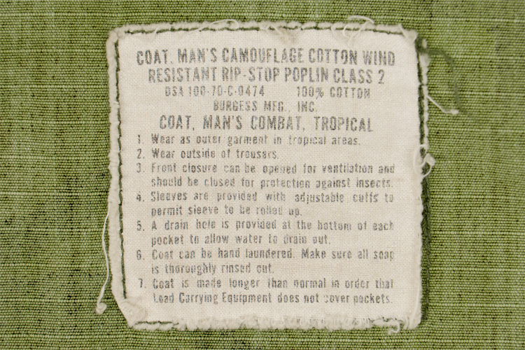 A five button front tropical coat with button flap, pleated breast and hip pockets with straight cuffs. The left breast pocket has "USMC" stamped to it. A label inside the neck has printed chest and height sizes, while another label to the bottom interior has care instructions and designation. A handwritten name is written to the interior neck line. Note: 1970-dated contract number.