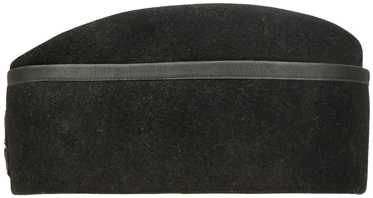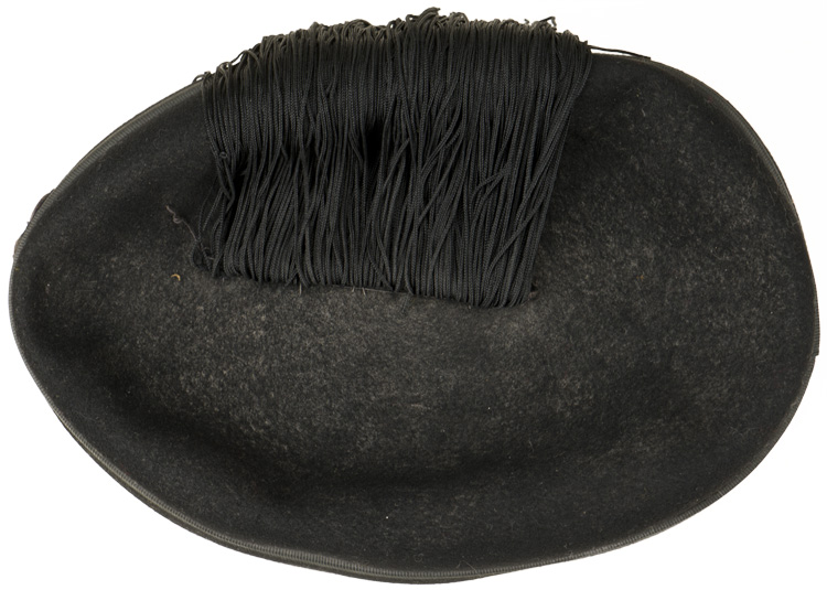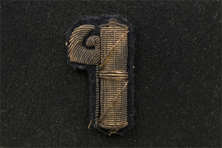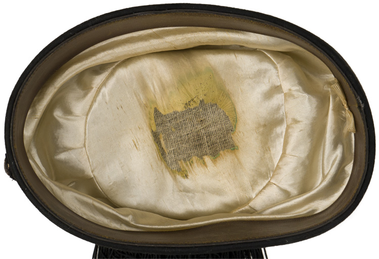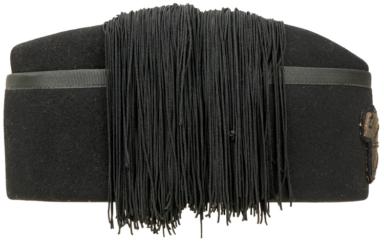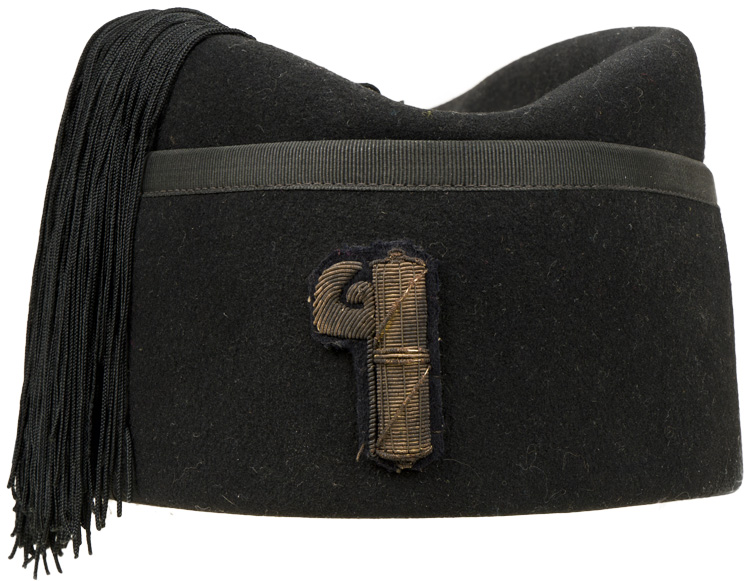 2. A black wool constructed cap that features all around side panels with vertically ribbed black rayon trim to the top edges which encompass the central oval crown. To the top of the Fez is a multi-strand black artificial silk tassel which was intended to hang over the right side of the cap. The front center of the cap features a hand embroidered cap badge features a bullion badge depicting the "bundle of sticks" with an axe. The cap is fully lined in white silk/rayon with a leather sweatband. The center of the rayon lining where he manufacture name/logo is has been cut out. The cap measures approximately 59.