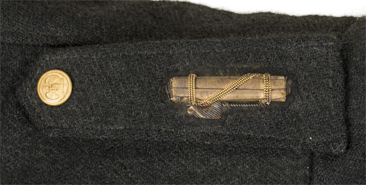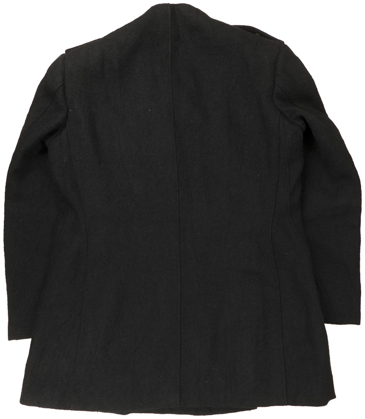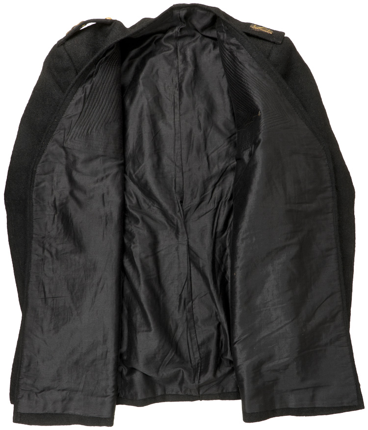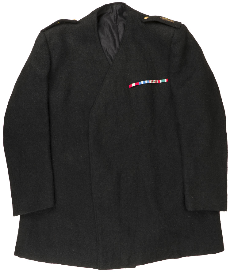 3. The heavy orbace jacket has a 50" chest and measures 90cm in length from the shoulder seam to the hem. A pair of heavy, button shoulder boards are sewn to either side of the neckline that bear a bullion "fasces" symbol with a gilt button. A four place ribbon bar is sewn to the left breast. The wool is in very good condition.