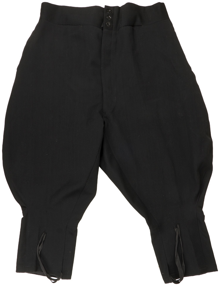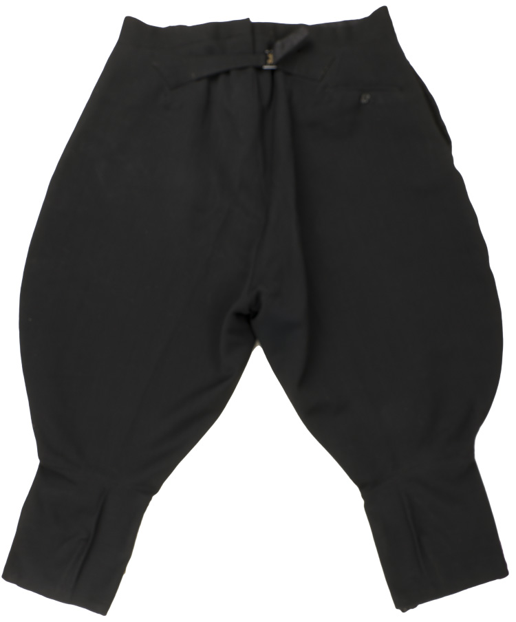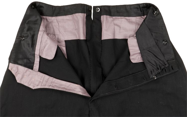 5. The black breeches has a six button French fly, with an additional three buttons at the waist, vertical slash pockets to the hips, a single rear pocket with button and an adjustment strap to the rear. Six buttons are sewn to the interior of the waistband to accommodate suspenders. The waist measures approximately 40" with a 25" breech.