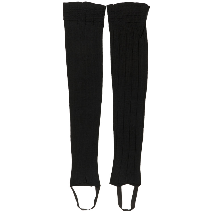 6. A pair of black knitted socks with cotton tapes to the bottoms to secure themselves around the heel of the boot. They measure approximately 72cm long. Very fine condition.