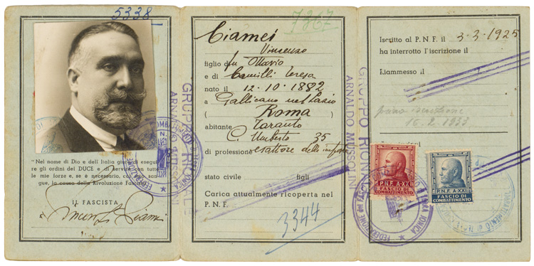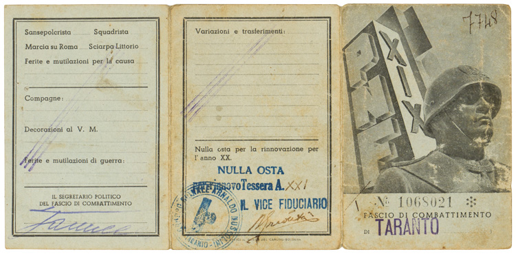 1. A "Fascio di Combattimento di Taranto" or Identification Card of the owner of this grouping. To the interior is a black and white image of the owner, along with personal handwritten details, membership stamps and office ink stamps.