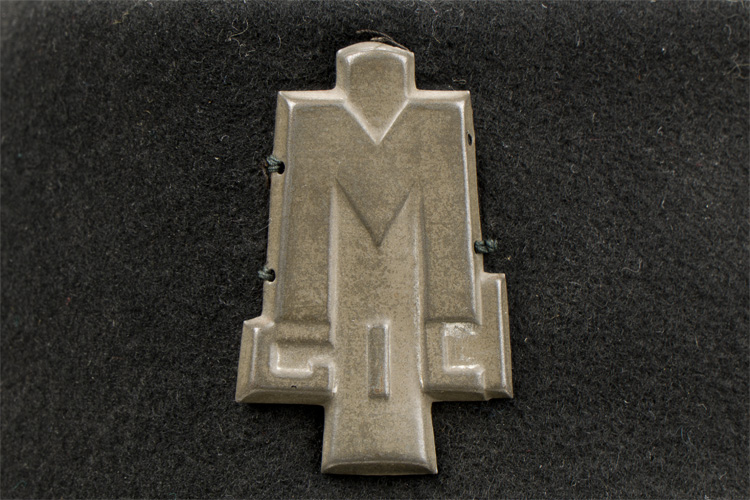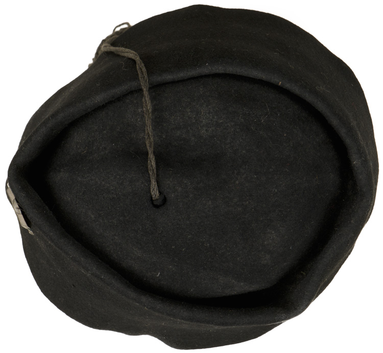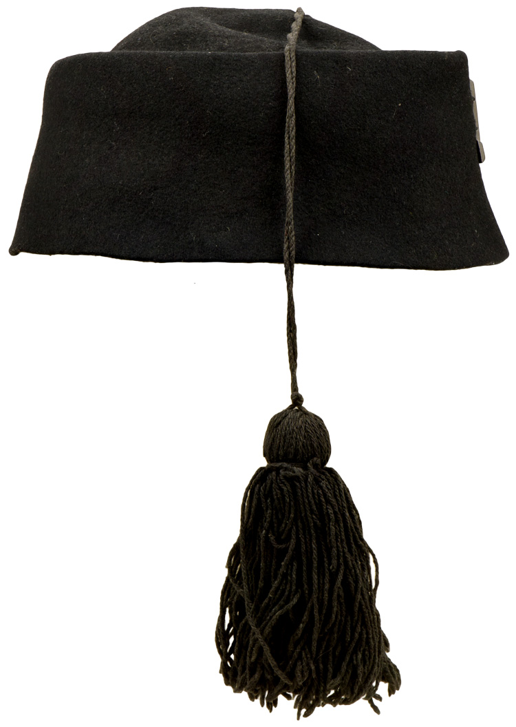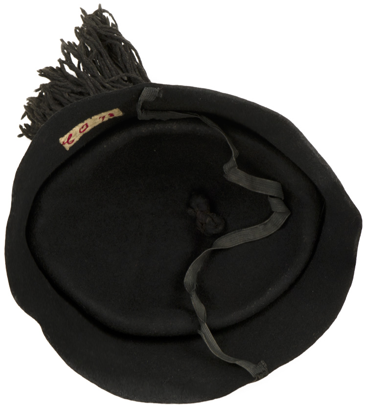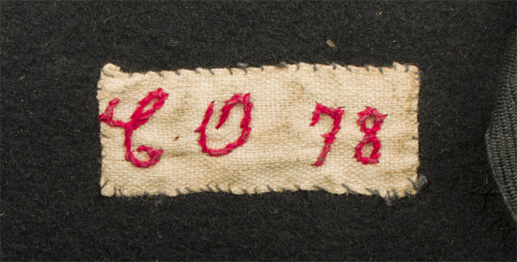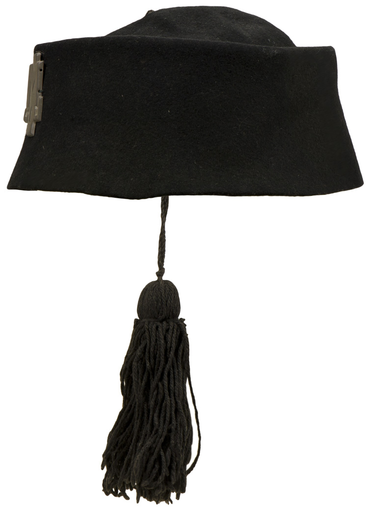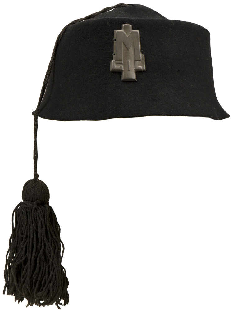 PHYSICAL DESCRIPTION: A black wool fez with a stamped metal badge with the letter "M" with the letters "GIL" to the bottom. The cap is unlined, but bears a hand embroidered white cotton label that reads "C.O. 78". Chin strap is in place that retains some of it’s elasticity. Some light surface wear and moth tracking.