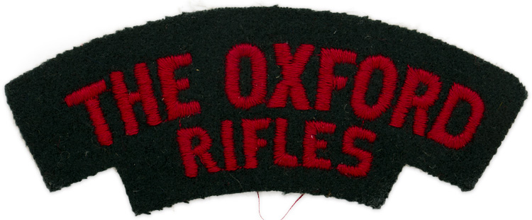 A melton, machine embroidered "THE OXFORD RIFLES" in red thread onto a dark green backing. Shoulder flash measures approximately 11cm x 4cm.
