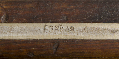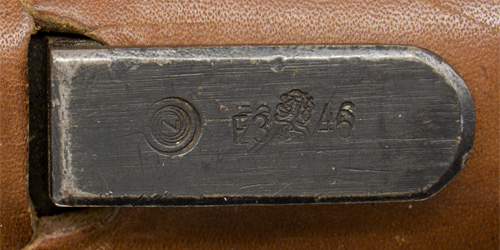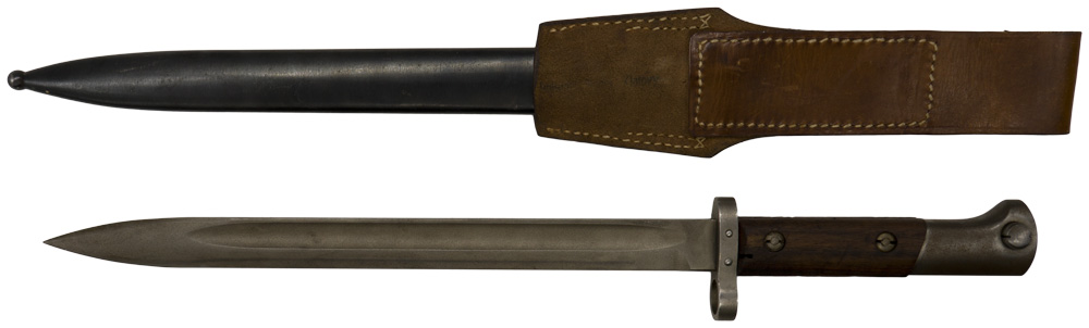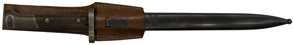 A model 24 bayonet, with its original scabbard. The unsheathed bayonet has an overall length of 43.5cm, whose contoured bird’s head pommel has a stud guide and locking stud. Its contoured wooden grips are fixed by two plain-headed bolts and slot-headed washers. The top of the pommel bears a three letter code of "tgf" for Zbrojovka Brno. The tang is engraved with "E3" , Rampant Lion and 48". The 30cm long phosphate finish blade is not marked to either side of the ricasso. The cross piece, also shows a phosphate finish and is also unmarked. The scabbard lug is marked with a CZ trademark, along with "E3' Rampant Lion and "46'. Included is a heavy, brown leather frog with strong stitching that is ink marked to the reverse.