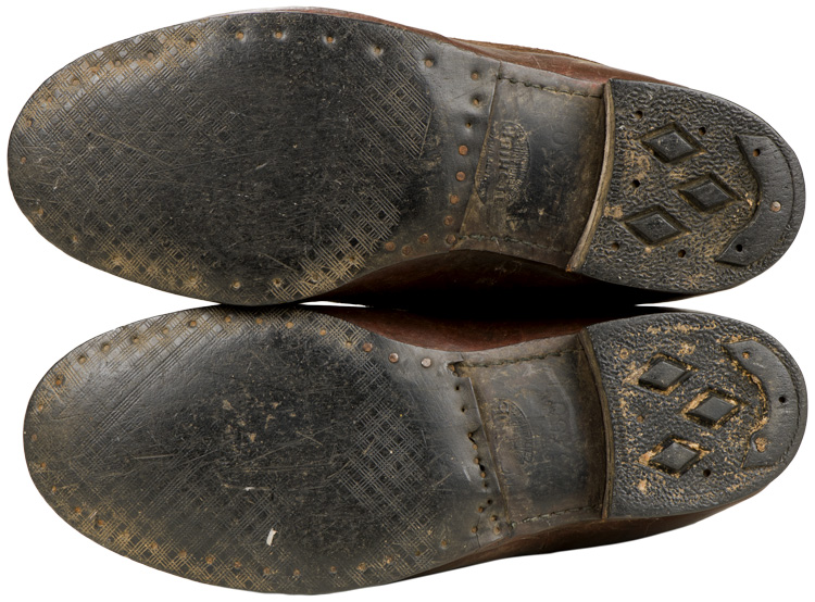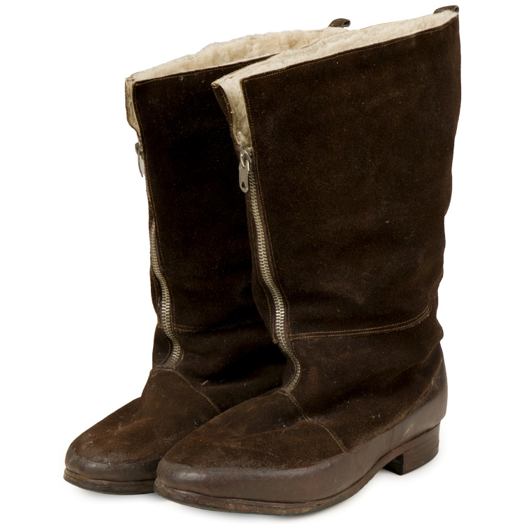 1940 pattern. Suede exterior, rubber galosh, and thick wool interior. There is a leather tongue located on the interior behind the zipper. Zippers function perfectly. Nicely Air Ministry marked. Size 8. Nice pair of hard to find 1940 pattern examples.