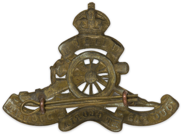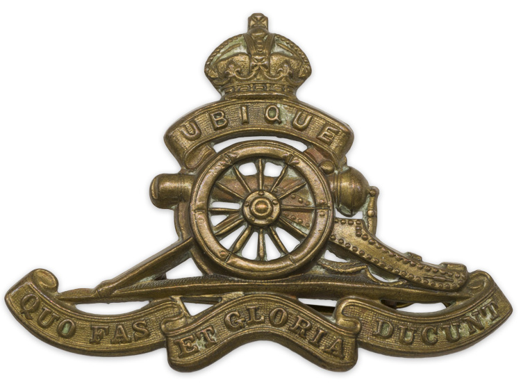 PHYSICAL BACKGROUND: A 7cm x 5cm, triangular shaped brass badge with cannon and a wheel with "Ubique" and "Quo Fas et Gloria Ducunt" both printed on scrolls at the top and bottom. A Kings Crown is located at the top of the badge. Complete with dual lugs and cotter pin.