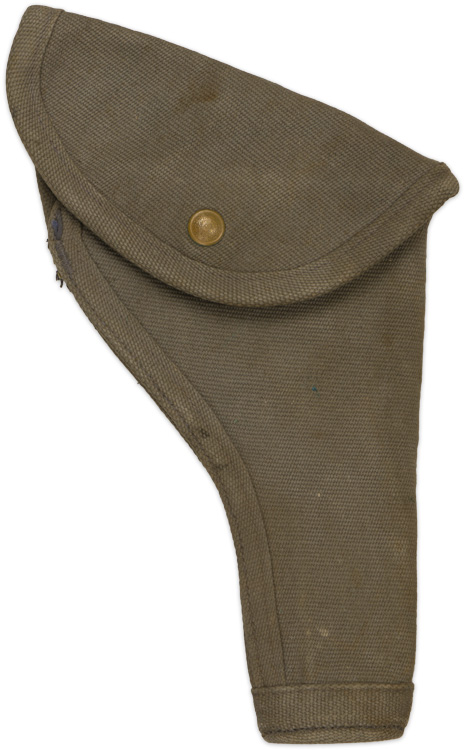 A standard RCAF issue blue-grey web holster for pistol or revolver with brass fittings. The canvas holster is about 32cm tall and 18cm wide along its top, tapering to 6cm at its reinforced base. It has a fold over top flap with brass snap closure. The edges are reinforced with additional stitched on webbing. There is a metal drainage grommet to bottom. Sewn to the reverse is a piece of webbing about 11cm by 7cm folded over on three sides to create loops through which three brass belt hooks have been inserted. Stamped in black ink to the interior top flap is faint makers mark and "C broad arrow", indicating it was issued through the Canadian Quartermasters Office, as well as "Z.L.& T.Ltd 1942". The holster shows typical usage, wear and staining.