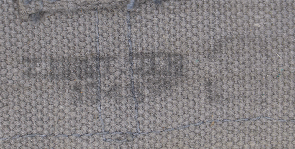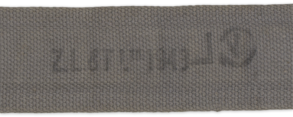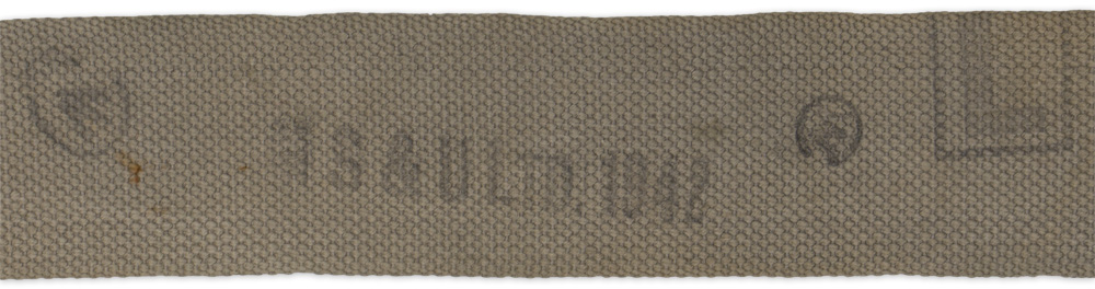 A pair of light blue grey webbed canvas, double pocket, ammo pouches with steel fittings and brass snaps attached to a pair of webbed shoulder strap.. Each pocket’s top fold over flap has a single brass snap closure which mates with one of two brass studs to each pouch front. To the reverse, on either side, are vertical painted steel belt hooks with, between them to the top, a vertical strap with a painted steel loop and another short strap with a painted steel buckle. A pair of standard RCAF, blue-grey webbed shoulder straps are attached that are stamped “M.S. & U Ltd. 1942" and “Z.L.& T. Ltd. 1943" along with a “C” broad arrow to each. They show typical usage and wear.