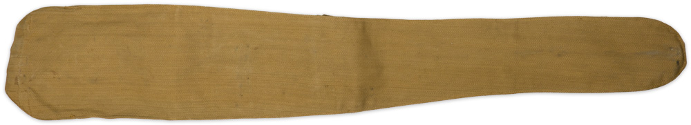 PHYSICAL DESCRIPTION: A standard size web rifle cover, about 116cm (45.5") long by 22cm (8.5") wide at the open end tapering down to a 13cm (5") wide rounded sealed end. The open end has two fold over flaps which would fold over the but of the stock, with the top flap having a webbed strap that corresponds to the friction buckle to the body, as well as a leather strap adding to the length. A webbed pouch with flap is present to the body and is used to carry a fifty round ammunition bandolier. Broad arrow marked and dated. Nice clean example.