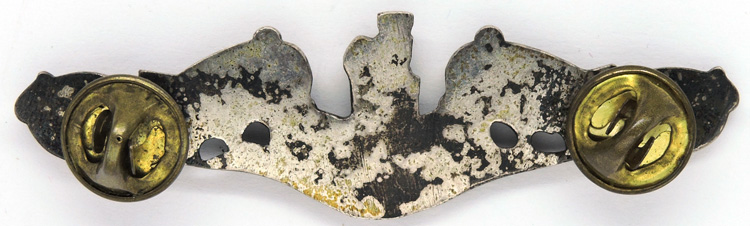 WW2 period USN officer’s ‘Dolphins’ submarine qualification badge. A 7cm long badge that has a pair of pins and pinch clasps to the reverse Unmarked. Of Note: This badge was worn above the left breast of the tunic and was nicknamed "fishes" or "dolphin".