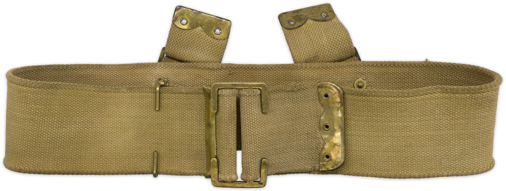 A 7.5cm wide x 94cm (37") tan/khaki webbed canvas belt with brass fittings. Either end of the belt feature a crimped plate with three grommet holes. One end passes through a sliding length adjustment buckle, is then cinched by a brass retaining loop, and has hooks proceeding from the top and bottom of its crimped plate which wrap around the belt itself. To the center of the belt are doubly rivetted, at diagonal angles, two extended tabs. Each of these terminate, at one end, in brass crimped plates with two grommet holes, and, to the other end, with sliding length adjustment buckles. There are some ink markings to the underside that includes the manufacture name, date. as well as a broad arrow.