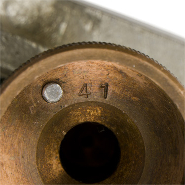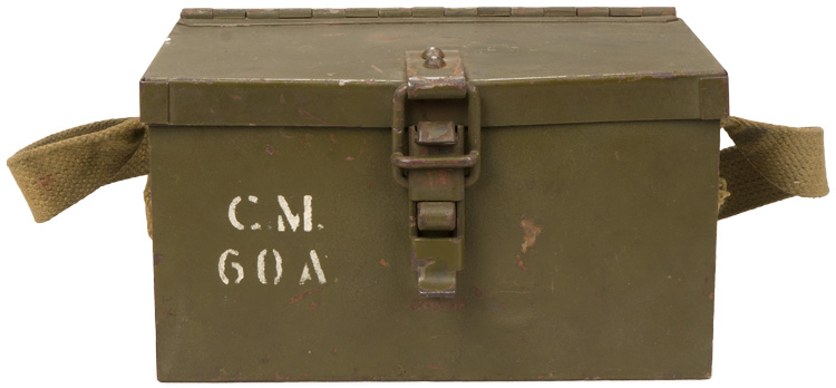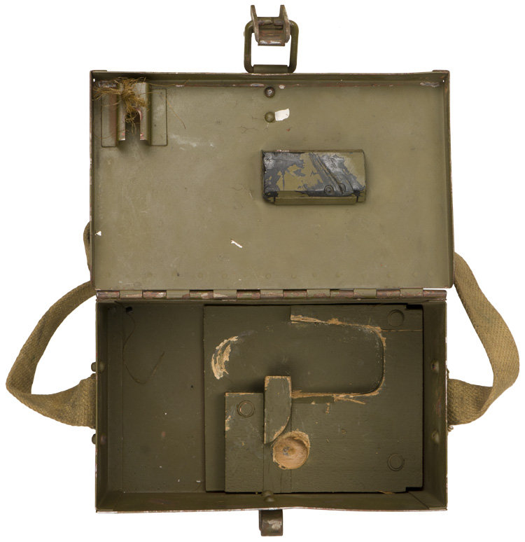 A site dial for the Vicker’s machine gun that is marked to the top "Site Lensatic Mk. IL.O.C" One of the sight levels has a 1941 date. Included is a 11cm x 12.5cm x 20cm magnetic allow, green painted case with webbed carrying strap.