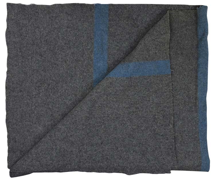 A grey wool blanket with blue 6cm wide stripes measures approximately 134cm x 224cm. Nice untouched example in excellent condition. Maker marked and dated for 1942.