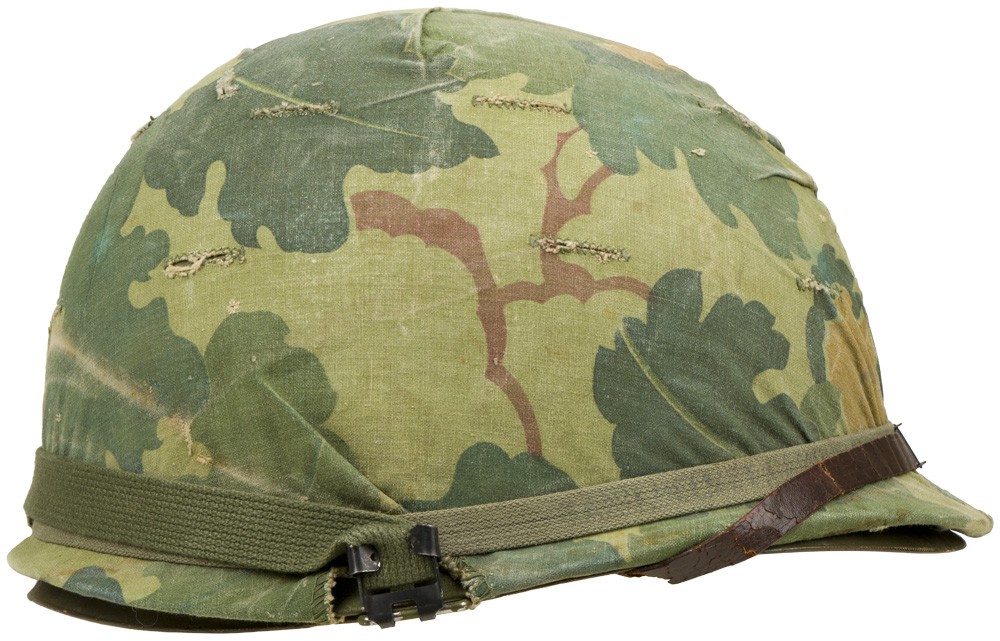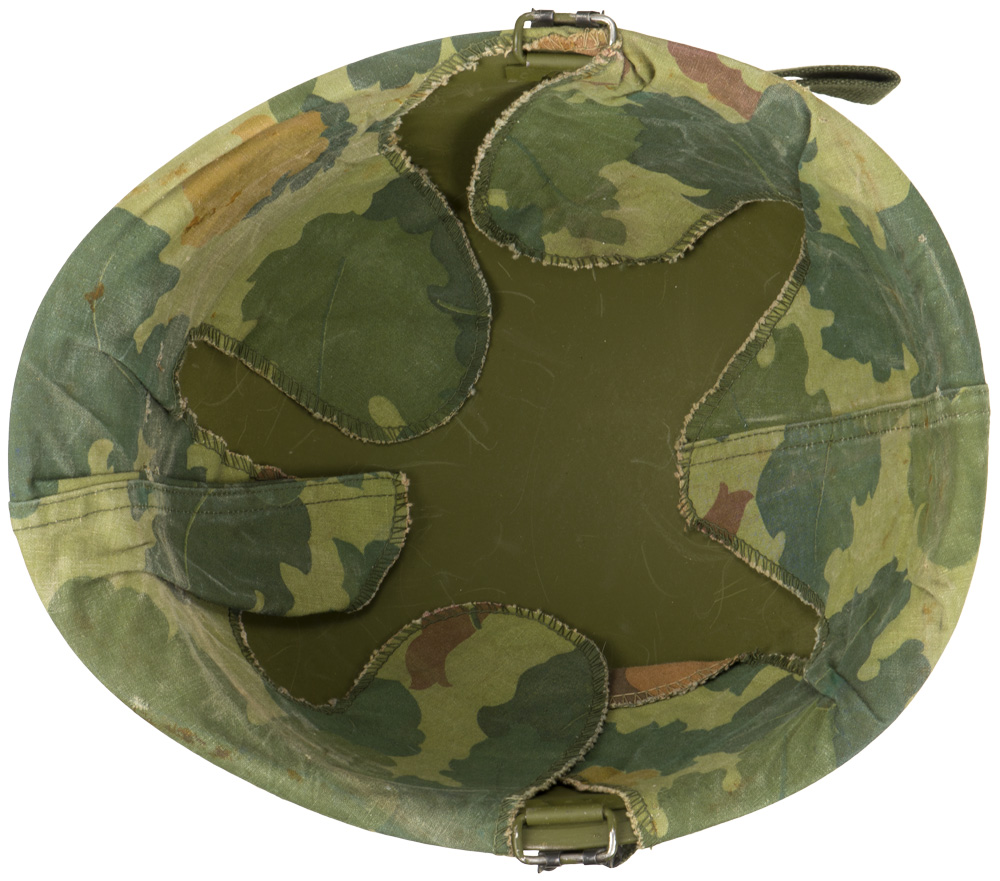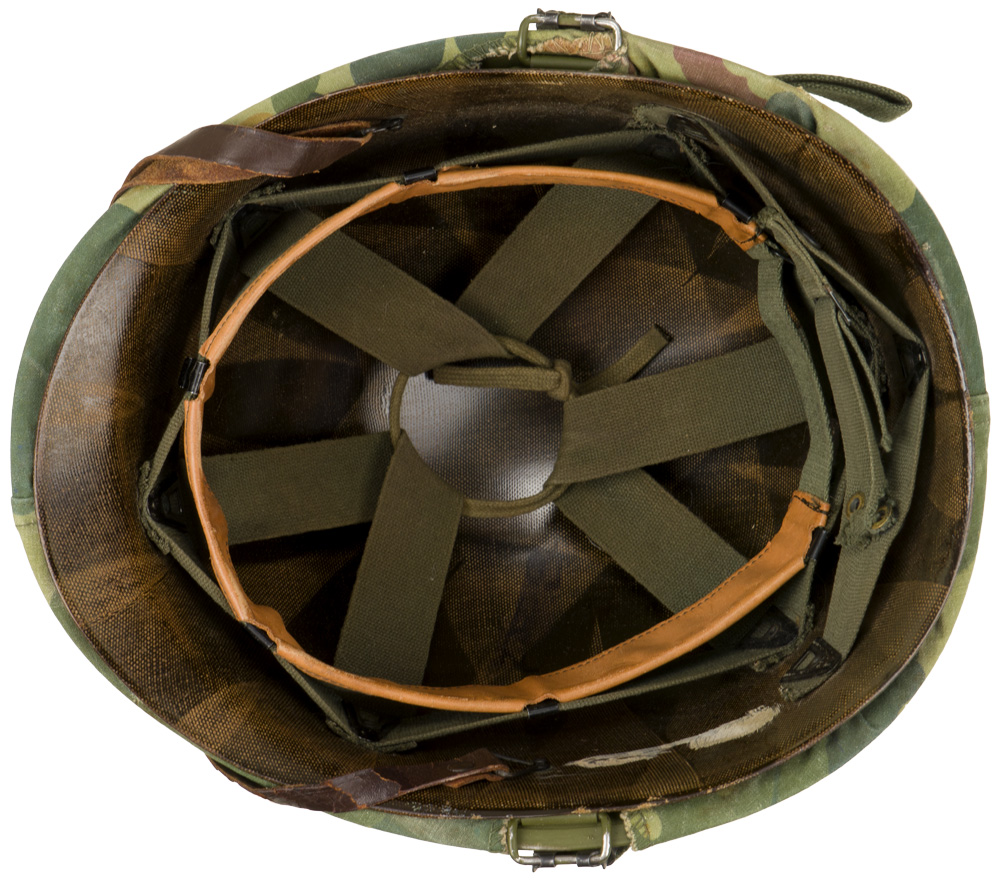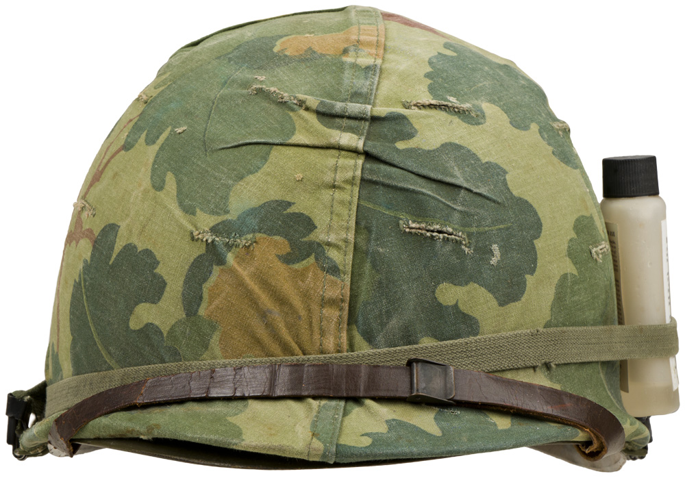 PHYSICAL DESCRIPTION: U.S. Vietnam War M-1 Helmet with Mitchell Camouflage Cover. Korean war era liner with 98 percent original paint. Mitchell cover is contract marked DSA 100-70-C-0822 indicating 1970 issue to the field. Original issue green elastic band holds cloth cover in place. Original brown leather liner chinstrap looped over the front brim of the helmet. With hard-to-find original issue "bug juice" bottle under the elastic camouflage bad as usually carried. Bottle still has a little of the original insect repellent in the bottle. Excellent complete untouched example of a midwar Vietnam M-1 helmet.