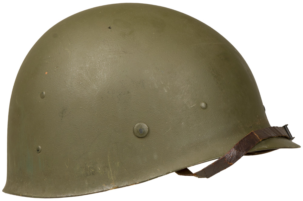 BACKGROUND: The M-1 helmet was developed as a replacement for the M-1917 helmet that had seen use since WW1. It was designed by using the crown of the M-1917, removing the brim and adding extensions to protect the neck, ears, and forehead. The resulting form was then used as a template for the production of a helmet body from a single piece of Hadfield Manganese Steel. The liner and suspension were developed after a modified Riddel Football helmet. The M-1 helmet was approved for production in June of 1941. Early models had solid loops (fixed bale) for the chin straps but they broke off to often and were replaced with a moveable hinged loop. The original rim of the helmet was made of stainless steel but it was found that the paint that was used would wear off to easily and leave a shiny reflective surface. To remedy this they switched to a Hadfield Manganese Steel and also changed the butt of the rim from the front to the rear of the helmet body. This change took place in October of 1944. The M-1 helmet had the best ballistic characteristics of any helmet developed up to then and could with stand the force from a 230 grain, .45 caliber bullet with a velocity of 800 feet per second.