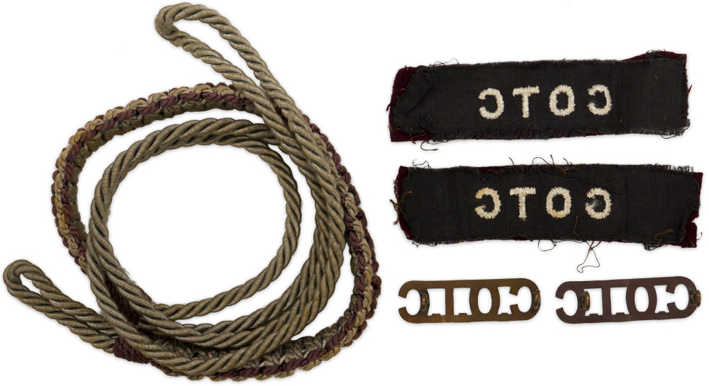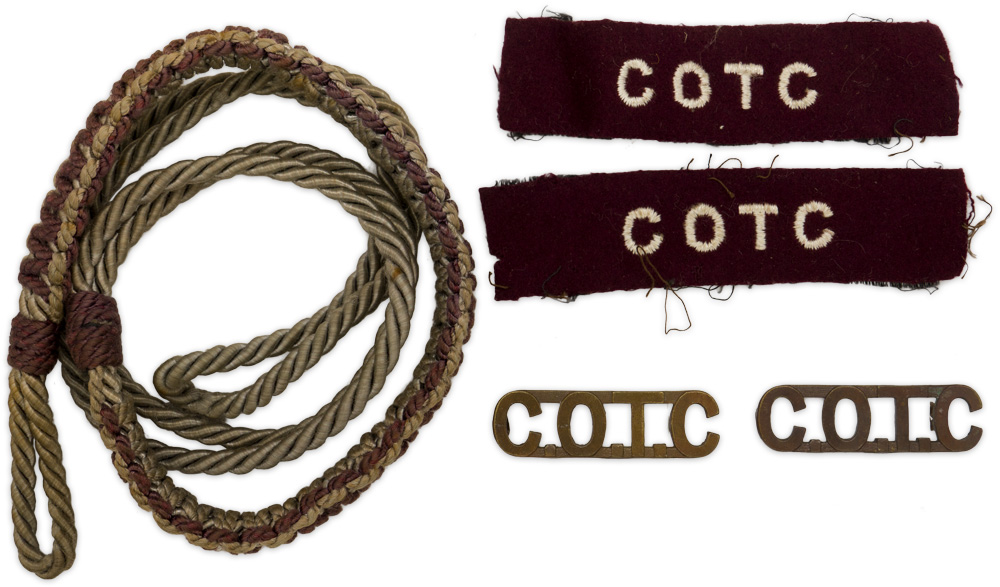 A grouping that consists of a pair of brass "C.O.T.C." shoulder tiles, a pair of wool, machine embroidered shoulder flashes and a lanyard.